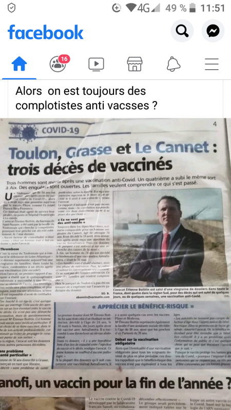 En lisant la légende sous la photo de l'avocat on peut lire que dans les dossiers qu'il traite les décès sont survenus quelques jours à quelques semaines après la vaccination. L'AZ est réservé à une tranche d'âge déjà à risque, il faut bien plus d'investigation pour pouvoir accuser directement le vaccin, surtout plusieurs semaines après. Il faut attendre pour en savoir plus et voir des ajustements dans la campagne vaccinale si besoin, comme avec chaque nouveau vaccin ou chaque nouveau traitement mis sur le marché... Mais ça prend du temps et ce temps c'est du flou. Et c'est humain que de ne pas apprécier d'être dans le flou, c'est instinctif de vouloir se protéger ou protéger les siens d'un potentiel danger. "Faute de pouvoir voir clair nous voulons, à tout le moins, voir clairement dans l'obscurité" disait Freud (je l'aime pas trop mais il a pas dit que des conneries), donc si les médias s'éclatent à monter en épingle le moindre couac, c'est aussi un peu beaucoup de leur responsabilité.