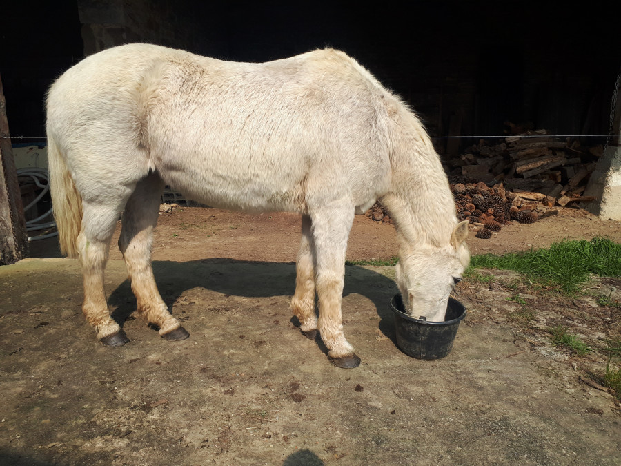 Actuellement, elle a repris un peu de poids à la sortie de l'hiver , elle a foin à volonté ( que elle mange à son rythme car il lui manque des dents ) et une petite prairie.