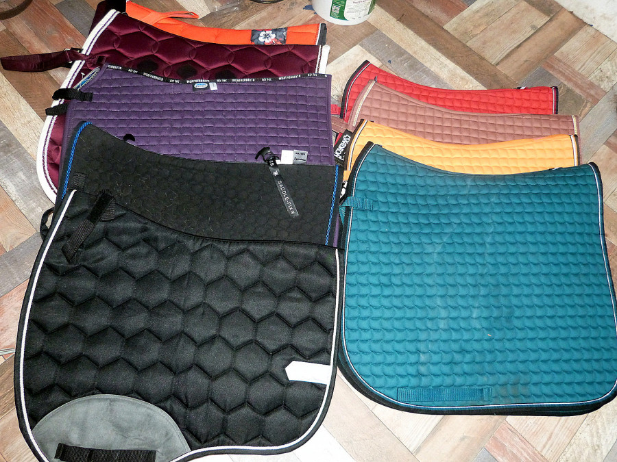 + : excellente qualité, bonne absorption de la sueur, couleurs sympas et plusieurs modèles de tissus, protection passage de sangle, passant du haut court pour attacher à l'anneau sur les modèles dressage