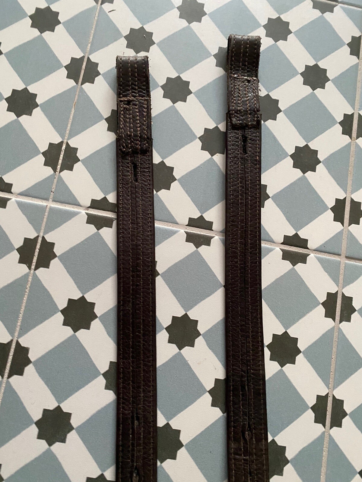 J'ai trouvé plein de photos sur le net d'étrivières de la marque de ma selle. Elles ne vieillissent pas super bien, je ne suis pas emballée, surtout pour le prix, donc j'ai laissé tombé (rien d'occaz en marron de toute façon).