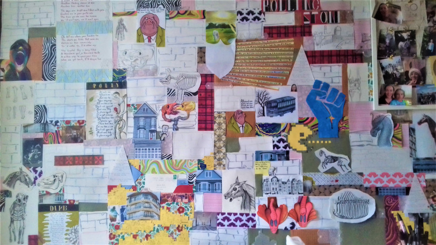 - cette même enfant dans une drôle de bibliothèque où les gens dessines et peignent à même le mur (pas du tout inspiré par la création ci-dessus, le dites pas à mon proprio please), avec des ref aux grands noeuds de l'intrigue de peint justement, la banane d'Andy Wahrol, le chapeau de Leonard Cohen, les marteaux de the Wall et le festin de Balthazar revisité ...