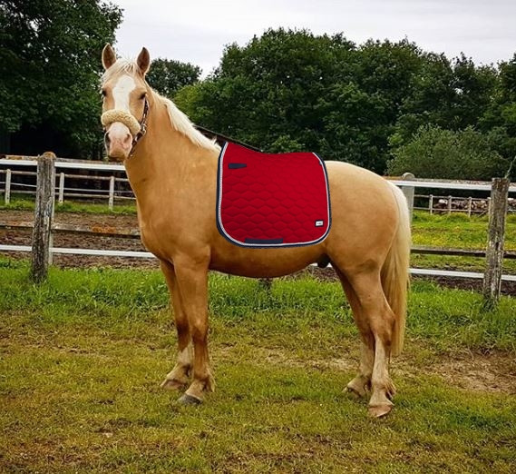 Un joli tapis de dressage rouge.