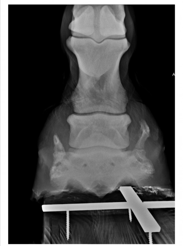 Résultat : arthrose en face antérieure de la 2ème phalange et ossification des cartilages ungulaires. D'après la véto, inutile de faire des radios de l'autre pied. Pour elle c'est sur qu'il y a la même chose, peut-être en moins développé mais présent quand même. C'est parait-il la "maladie des chevaux de trait"