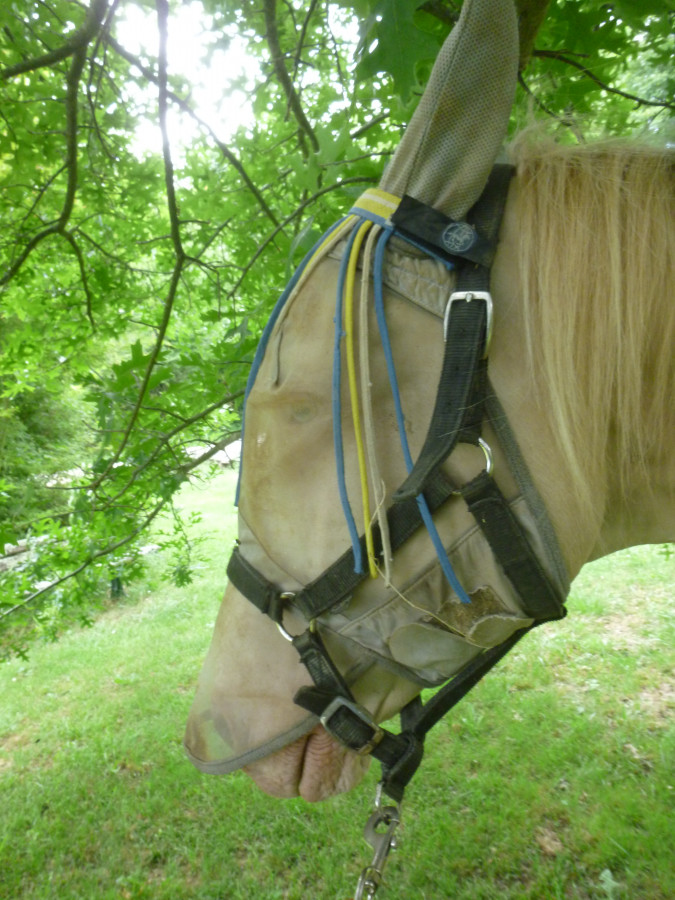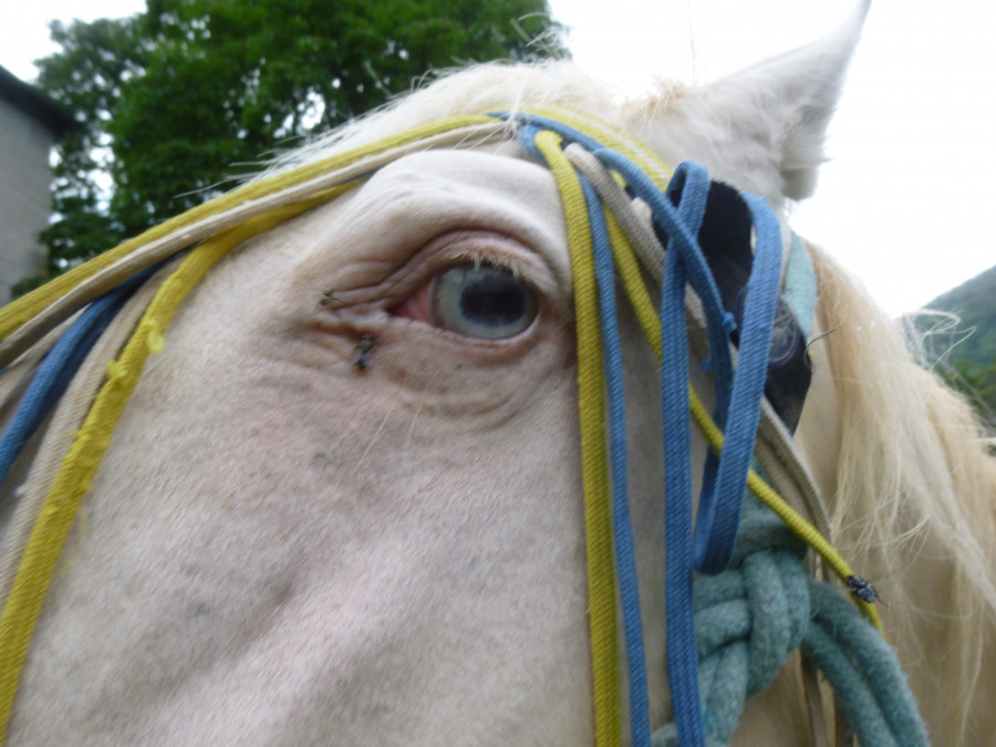 J'ai aussi un problème d'oeil qui coule. Le 18 mai, le véto est venu faire le vaccin grippe-1 et a constaté l'oeil qui coule, sans doute à cause des mouches car je n'avais pas encore mis le spray. Il me dit de mettre de l'anti-mouche avant que ça ne parte en conjonctivite.
