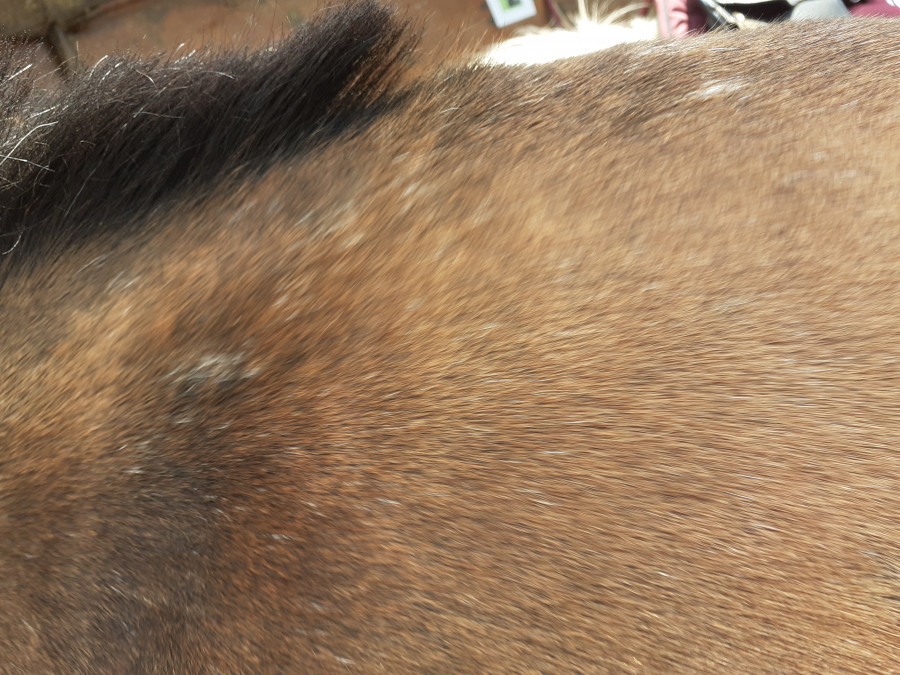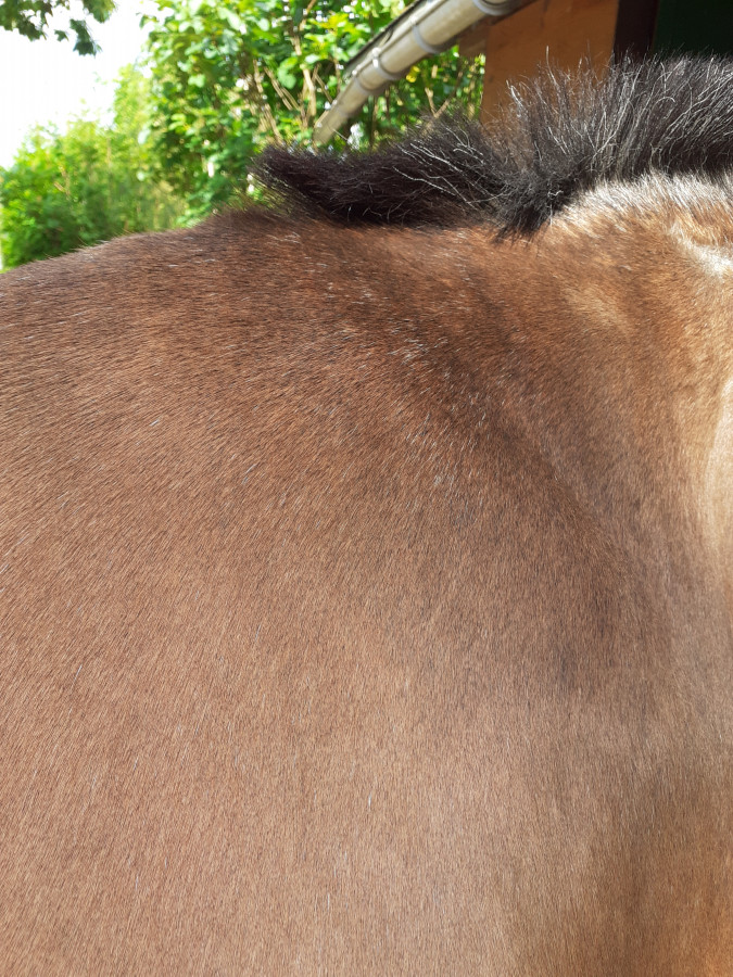 Un air fatiguée oui, la chaleur la mets souvent comme ça. Je fais de tout vraiment et elle vit 24h sur 24 au pré