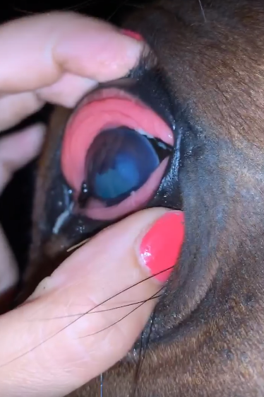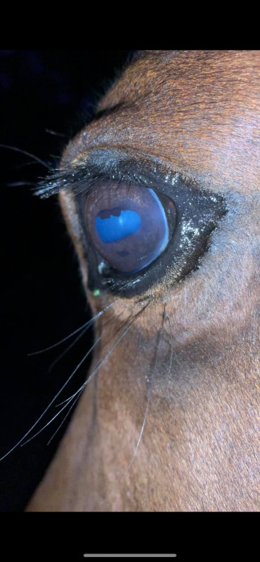 Eh bien ça n'a pas suffit, ce soit un bel ulcère bien visible (exactement au même endroit que tous les précédents alors que l'ophtalmo m'avait assuré que ça n'arriverait plus, que pour les autres c'était juste qu'avec mon ancien véto ça cicatrisait mal etc...). ?il gonflé, fermé, qui coule + beaucoup de pus. La jument se gratte fort aussi.