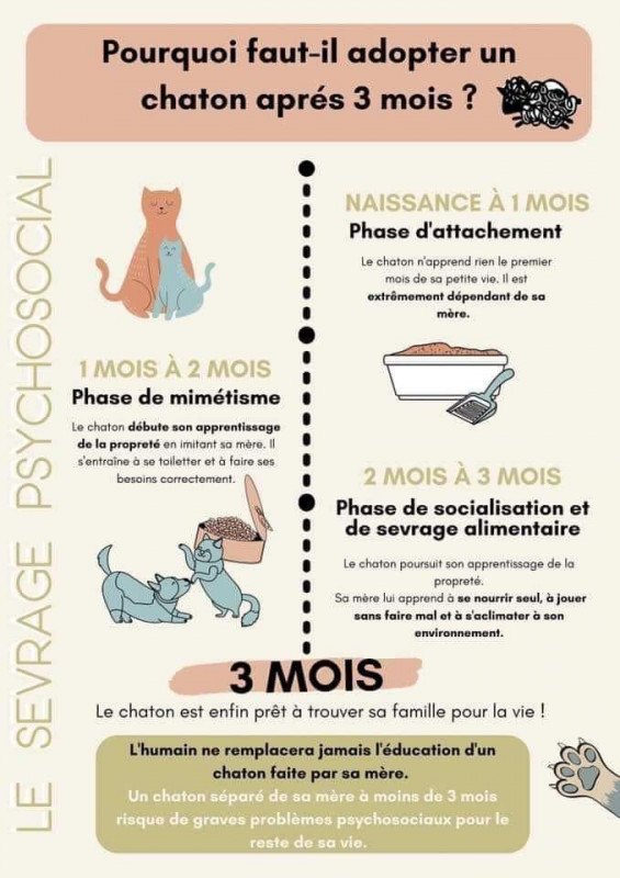 On est obligé d'enfermer la petite dans une pièce quand il est là car il nous la dégomme. Et il ouvre les portes. Il est aussi très peureux et continue de téter. Bref si j'avais un jour la possibilité de choisir en effet j'aurais tendance à respecter l'âge minimum mais malheureusement nous n'avons jamais choisi nos chats, ils nous choisissent.