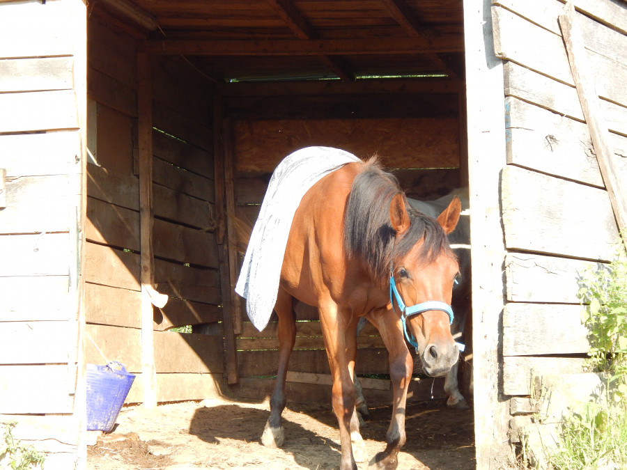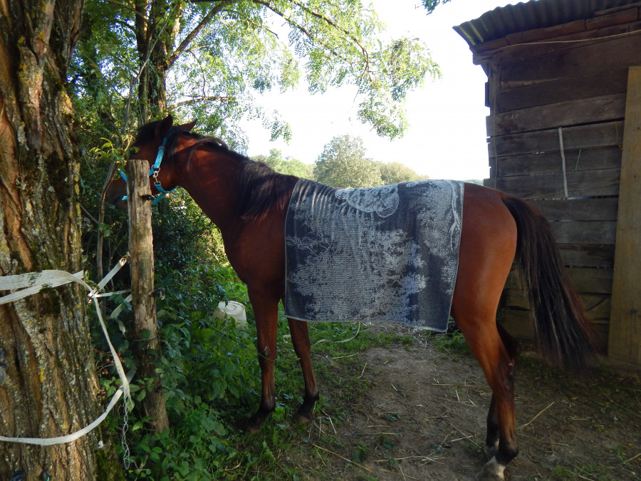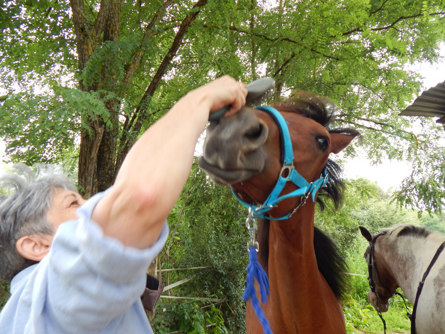 * pansage en liberté : étrille, bouchon, peigne, avec pschitt démêlant et curage des pieds. Et surtout enlever les chardons du toupet! Mise de la crème solaire, nettoyage de nénés