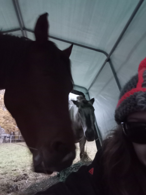J'arrive à 10h, un pansage pour Kerguélen qui c'est endormie en ronronnant pendant le brossage des crins. Puis je le tenais en attendant qu'il arrive, elle mangeait au foin. J'ai fini par laisser la longe sur le dos et essayé de me caler parce que j'avais froid. Après l'échange de sms avec cam je lui dis pour rire "il passera pas", a 14h j’appelle la clinique. La secrétaire gênée m'annonce qu'il est parti pour une urgence depuis ce matin et ne sera pas dispo de la journée. Ok... Je reprends rdv pour vendredi.