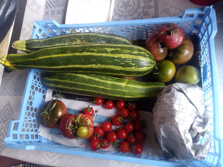 Le jardin qu'on a fait au pré commence à donner. 2 à 3 courgettes par semaine. Et les tomates cerises sont lancées. Les autres tomates aussi mais elles ont des formes bizarres :(