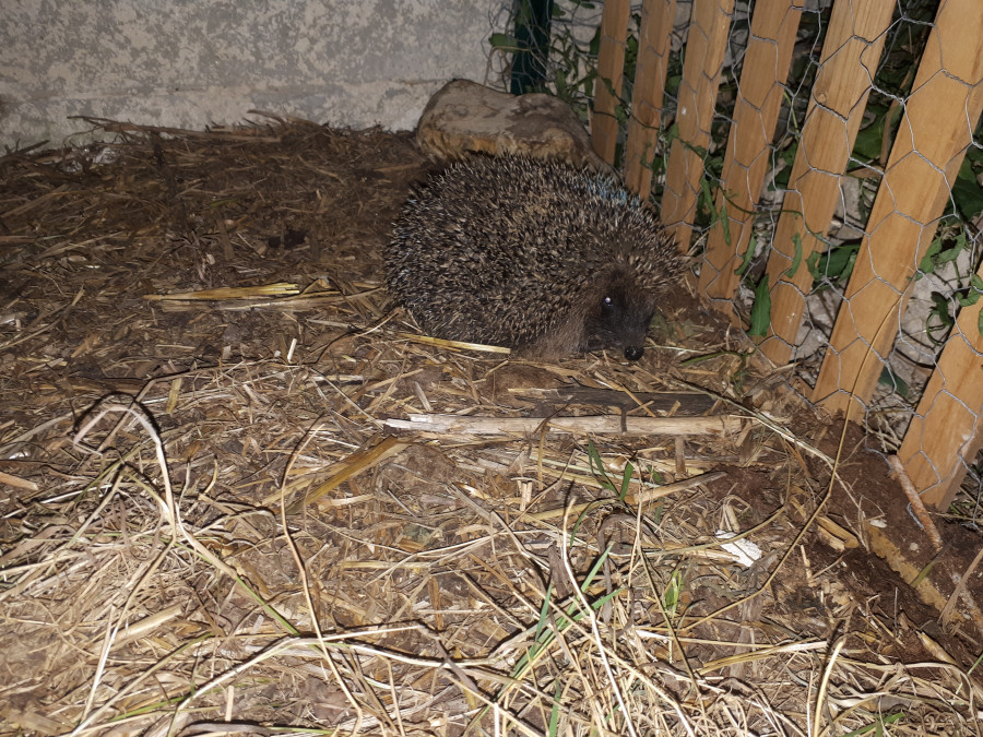 Le premier (Tac) qui était arrivé à 100g fait maintenant quasiment 600g et a été mis en enclos de réadaptation dehors. Je suis très fier de lui car dès la première nuit, il s'est construit son nid dans l'abri avec la paille, les feuilles et un reste de tonte que je lui avais mis à disposition.