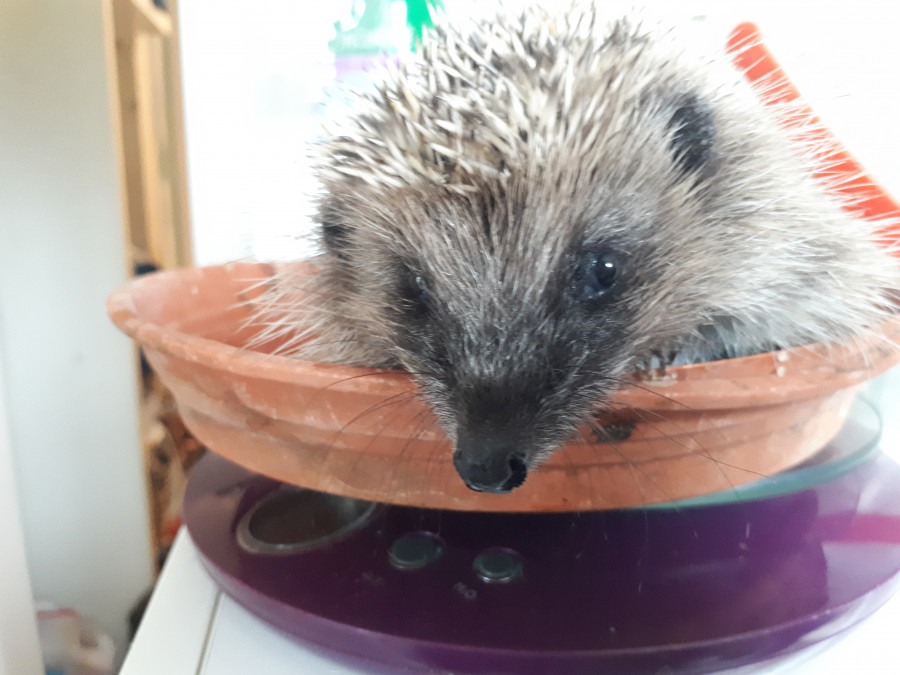 Tac - bébé hérisson arrivé à 100g le 14 juin trouvé en plein jour par une dame. Un vrai glouton qui pèse maintenant plus de 200g et n'a donc plus besoin de bouillotte. Il passe sa vie à manger et aime à peu près tout (pâté, fruits type banane, abricot, fromage de chèvre, bouillie de croquettes sauf ... les croquettes sèches. sauf que normalement à son âge, il doit basculer sur des croquettes