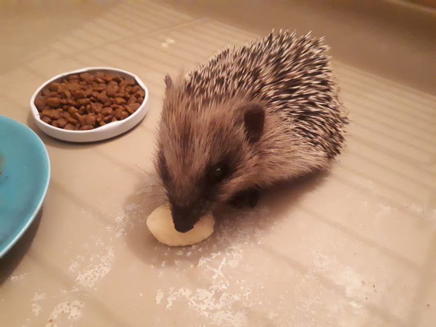 Tic - bébé hérisson mâle extrêmement maigre de 160g arrivé le 19 juin, recouvert d'une trentaine de tiques et ayant certainement la coccidiose et la teigne ou gale. Directement passé sous antibiotique sur les conseil du vétérinaire et de l'asso. C'est mon inquiétude du moment car sa prise de poids est erratique et il n'aime pas grand chose (pas la pâté, pas les fruits, pas la bouillie croquette, pas le RC convalescence...) hormis les croquettes donc il est surveillé comme l'eau sur le feu. On a fait un vermifuge donc on espère que ça va aussi l'aider.