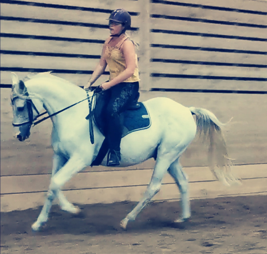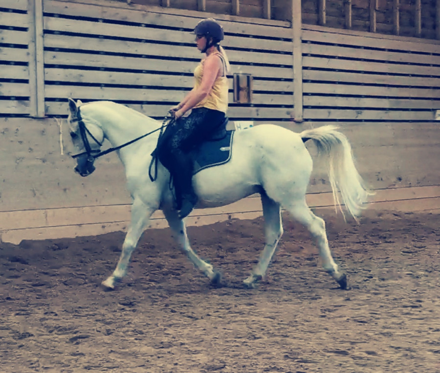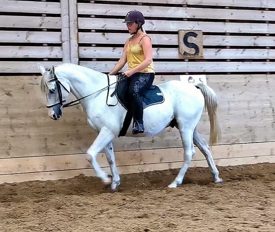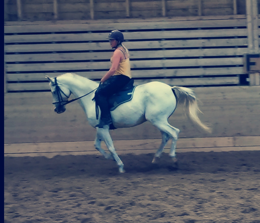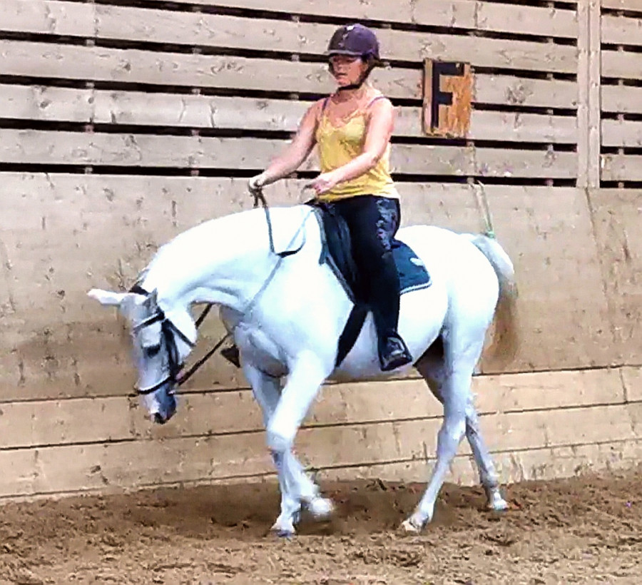 Au trot enlevé : tu sembles déséquilibrée dans ta selle, avec une difficulté pour trotter enlevée et donc une tendance jeter ton bassin et à t’asseoir un peu lourdement. Des rênes un chouilla plus courtes t'aideraient sans doute pour éviter les ruptures de contact, on a une attitude non fixe de l'encolure qu'on pourrait améliorer par une meilleure fixité des mains. Tu fais le grand écart entre ta main gauche et ta main droite, la gauche n'a pas besoin de monter autant, en revanche, la droite pourrait être plus présente.