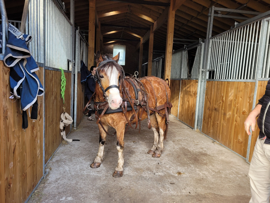 Hadley est très studieu. A part sauter les petites flaques d'eau. Il est parfait. J'ai fait un tour en caleche avec le pro le 31. Il a la ligne bien que encore gras!