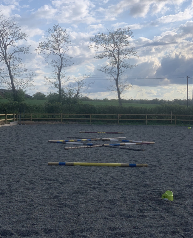 Le trou est en haut, modifié cette fois avec une belle bâche bleue qui m'a valu un sacré bon sur le premier saut. Et travail sur le fait d'aborder de petites combi à 3 foulées. C'est tout petit mais le plot rouge est assez directionnel, il doit faire 1,5 de large env. Tout bien fait !