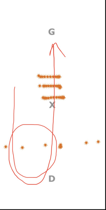 Trois barres au sol au trot sur le doubler longueur avec couloir de plots avant et après (passion plot !) et deux passages imposés a env 12/15m je pense du passage d'abord des barres. J'ai fait une sorte de croquis, pas aux dimensions bien sur mais pour mieux comprendre.