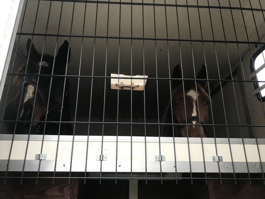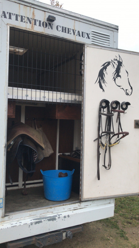 Pendant le confinement Chéri s'est attelé à améliorer mon camion. J'avais deux seaux à la place des mangeoires. Et la sellerie n'était pas fermée. Du coup j'avais toujours du foin plein la sellerie et d'un point de vue sécuritaire j'avais toujours peur qu'un cheval ait l'idée saugrenue de sauter dans la sellerie pour sortir.