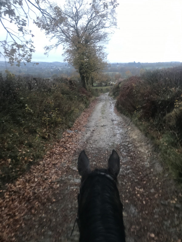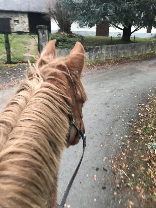 Pour Dédé le lendemain j'ai tenté une première. Balade en licol etho. Je ne sais pas bien comment fixer mes rênes dessus lol je veux pas les mettre en dessous car question direction je trouve pas ça top...