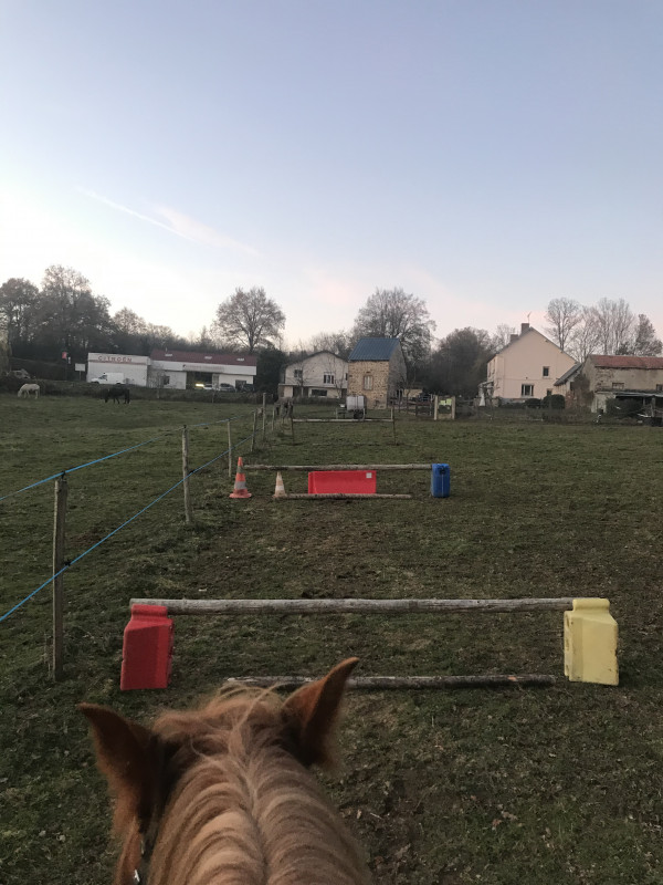 Objectif monter comme s'il n'y avait pas d obstacle, garder le galop, 4 foulées et avoir une courbe correcte. Y avait un petit saut de puce aussi à l'autre bout de la carrière à faire avant et après la ligne. Elle a été vraiment bien ! Bon galop, tendue, contente de sauter.