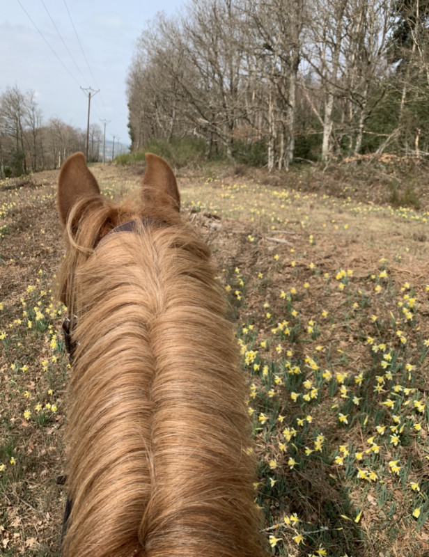 Samedi belle balade avec cheri pour profiter du temps clément. On a même pu ramener un bouquet de jonquille. Des grands galops dans les chemins avec deux poneys qui avaient la grande forme. Le top !
