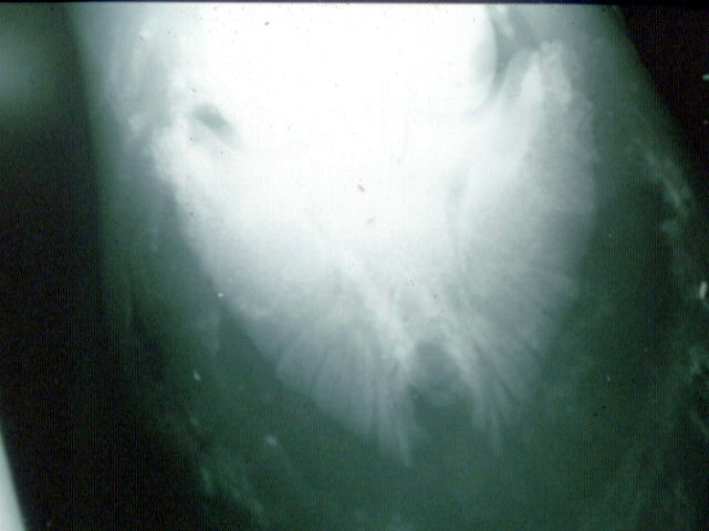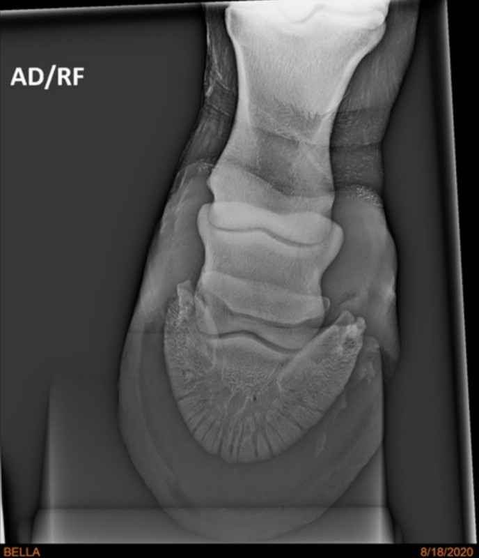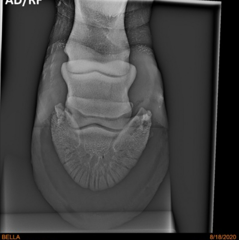 abcès qui a duré 7 mois et demi, Boiterie typique abcès qui s'atténue en une semaine, on passe par tous les diagnostiques possibles, faute d'examen radiographique, la jument est mise au parc. Ce sera une déformation de la paroi en pince qui va pousser le client à faire une radio (à l'époque pas de radio mobile).