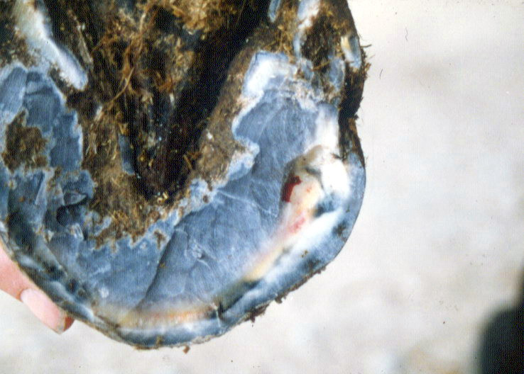 Superbe abcès du postérieur, sortie en pince après grattage. L'ampleur de la galerie faite sous la sole est assez belle. Ensuite toute la sole avait sauté.