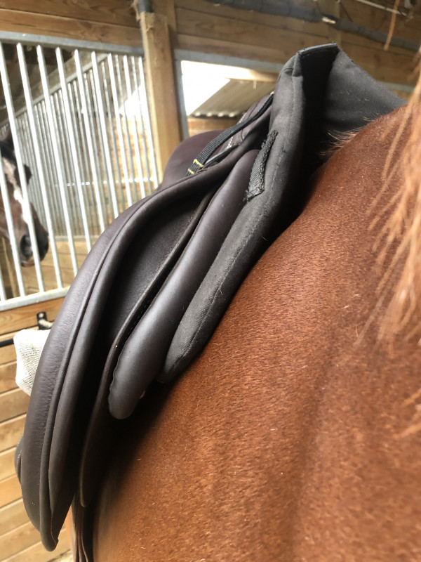 J'essaye actuellement une selle de dressage. Pour le contexte, je vais l'utiliser à peu près 2 à 3 fois par semaine puisque j'alterne avec ma cso. Et pour ceux que ça intéresse, on a finalement adapté au mieux avec des cales, et ma coach trouve la jument moins creuse au niveau du garrot (et de la supposée atrophie musculaire).