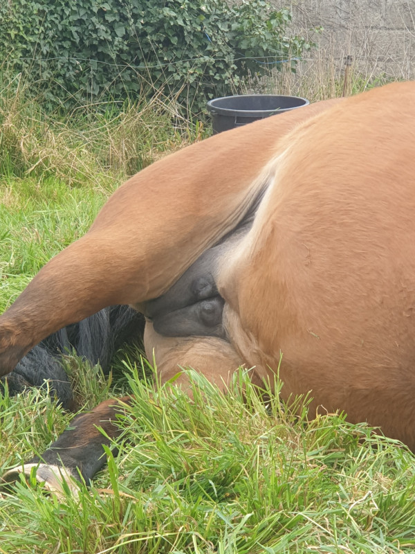 Une petite pouliche est née à midi et demi aujourd’hui. Beaucoup de blanc et des yeux bleus sans gêne overo, comme son demi frère par le papa ne le mois dernier… maman et bébé vont bien je suis soulagée.