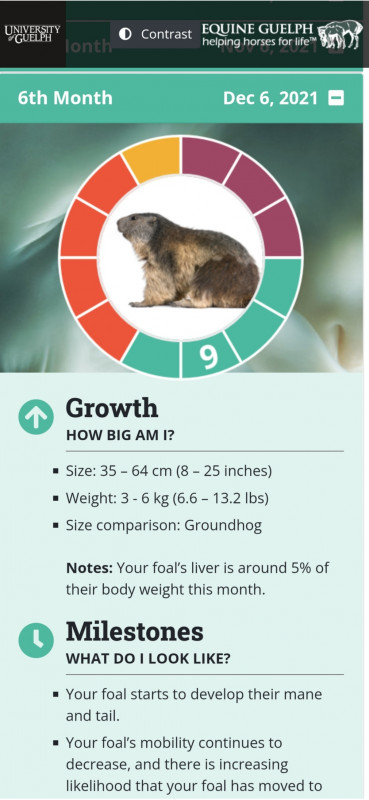 J'ai déniché ce site en anglais assez sympathique qui permet de suivre l'évolution du poulain donc je vous le mets ici pour ceux qui sont curieux : https://www.equineguelph.ca/pregnancywheel/.