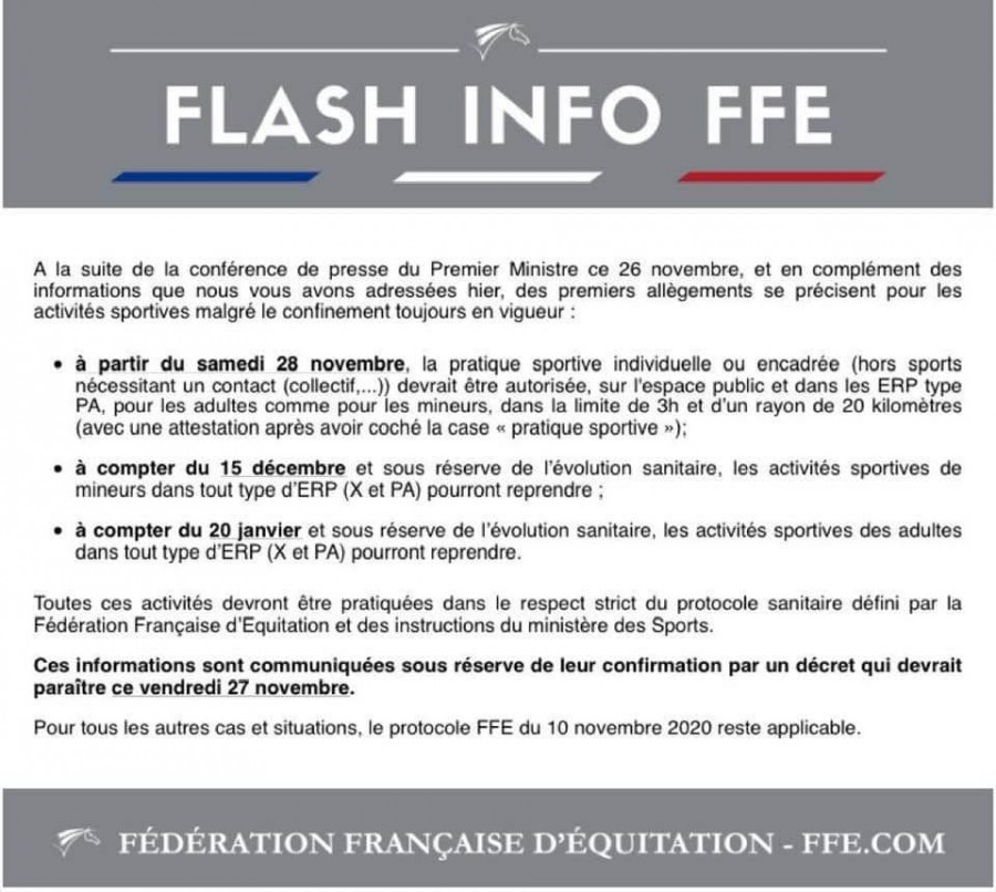 Dans l'attente, ces annonces sont à considérer en complément des mesures spécifiques obtenues pour l'équitation et précisées dans le protocole FFE, validé en réunion interministérielle le 10 novembre 2020.