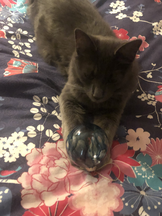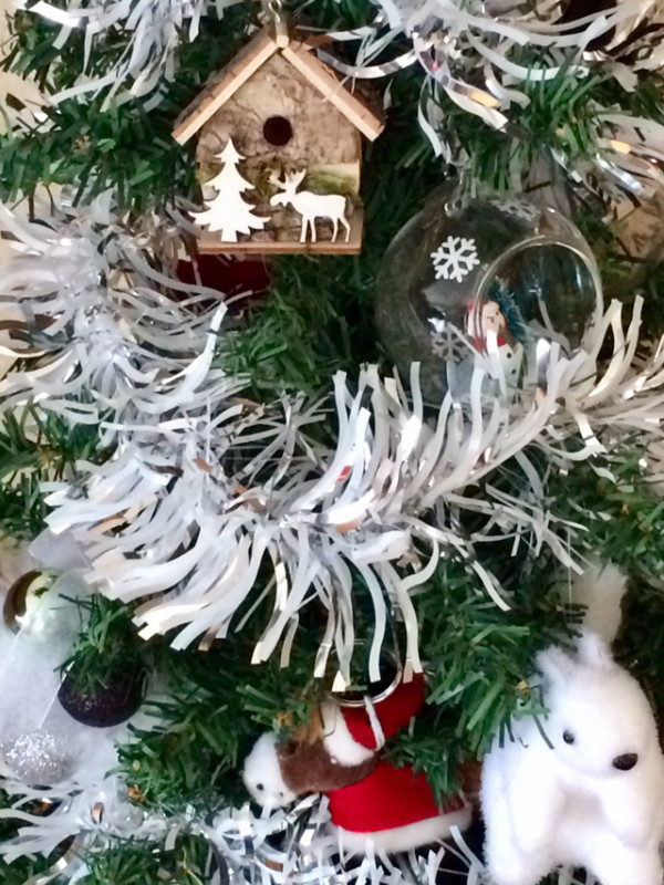 Pour l’instant, il ne s’est attaqué qu’aux decos du bas, il les décroche et les fait rouler mais ne les casse pas. Le soir je ramasse ce qu’il a fait tomber dans la journée et je le raccroche, et voilà