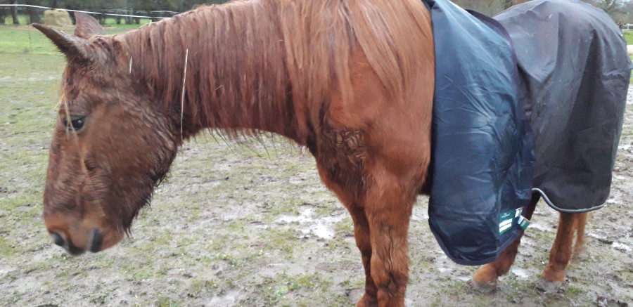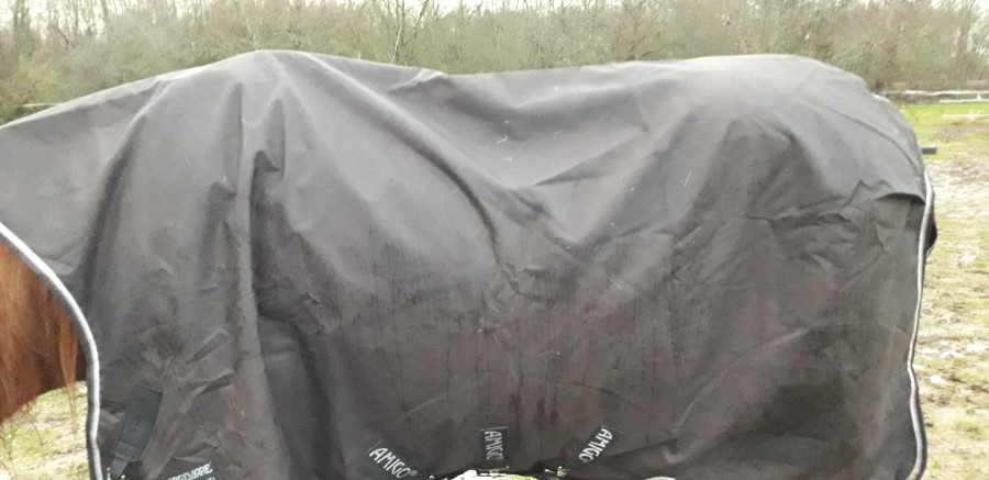 1 h de pluie un peu forte, suffit pour tremper le poitrail, si la jument ne se met pas dos à la pluie.
