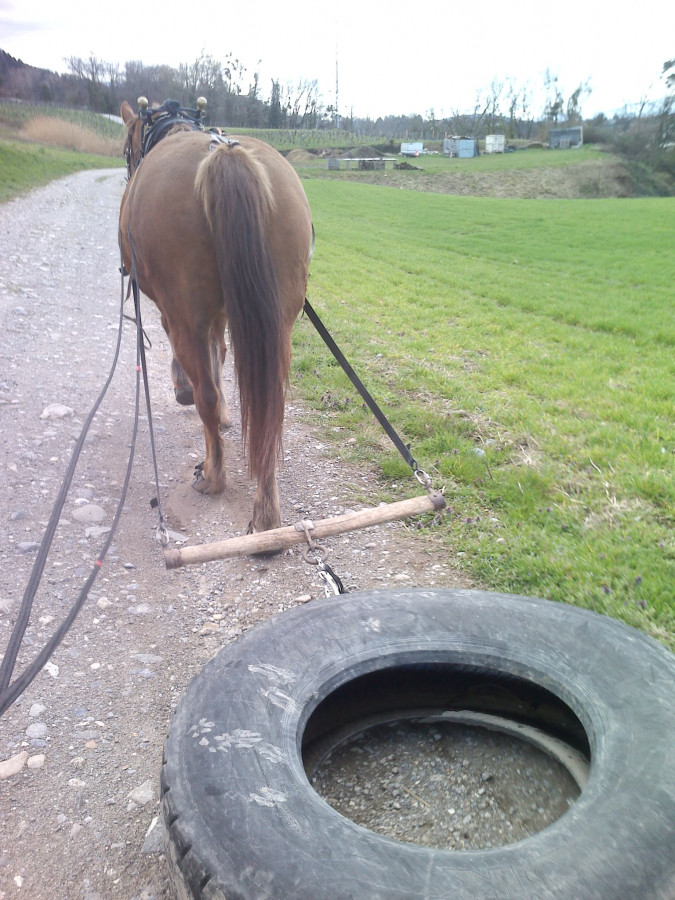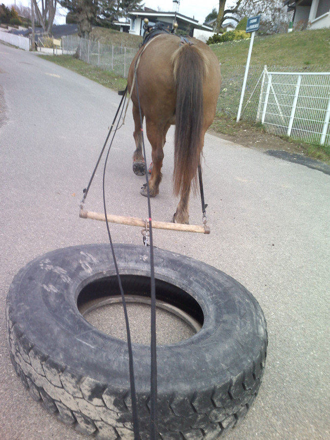 Je la garnie puis on attelle le pneu et hop (c'est rigolo ,elle sait quand c'est "serieux " et ne bouge pas )