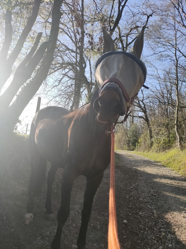 On a bien marché puis il a été ravi de la "surprise" que je lui avais préparée ! Il a fait un tour de galop puis miam-miam et s'est roulé ! J'irai le remmener ce soir.