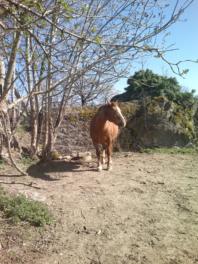 Lotus a encore perdu un coussin de poils, j'ai balayé pour ne pas en laisser trop aux oiseaux sinon ils auraient trop chaud dans leurs nids ! lol. Arrivé devant le gué cela m'a fait un prétexte pour lui monter sur le dos ! Comme il est noir il était brûlant ! J'ai traversé à pied sec et je me suis forcée à descendre, j'étais trop bien là-haut. (je suppose qu'au bout de quelques minutes les poils dans le pantalon m'auraient démangée ! lol) un peu plus de 5 km mais on a bien profité du soleil des fois je me sentais cramer.