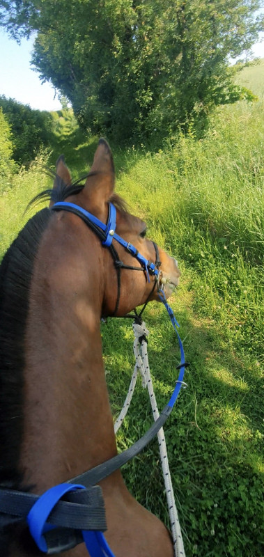 J'avais envie de travailler la monte en licol donc je suis partie en 4 rênes avec objectif ne pas toucher au mors (mais je l'avais pas sécurité quand même). Les transitions sont nickels, pas, trot, galop ! La direction est par contre assez approximative. Suffisant pour bifurquer sur un chemin mais pas assez précis à mon goût... a travailler donc !