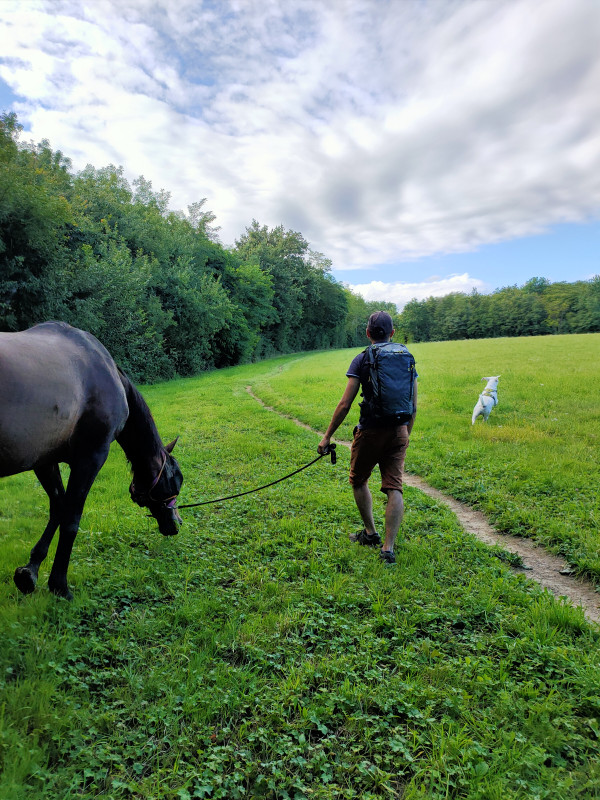 Quand j'ai croisé le type, il lui aura fallu un temps de réaction pour qu'il lève la tête de son téléphone quand j'ai dit "mon cheval tape". Dès qu'il a appelé le chien, hop, il est revenu vers lui et Salut. J'étais loin de penser que le chien me suive et surgisse de nulle part.