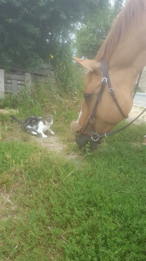 Les voisins ont adopté un chaton , celui ci est tellement curieux qu'il vient sentir Or quand elle broute ( lors de la pause brouting au retour de balade ) , j'ai une jument qui adore les autres animaux ! Elle tend volontier son nez pour sentir et toucher
