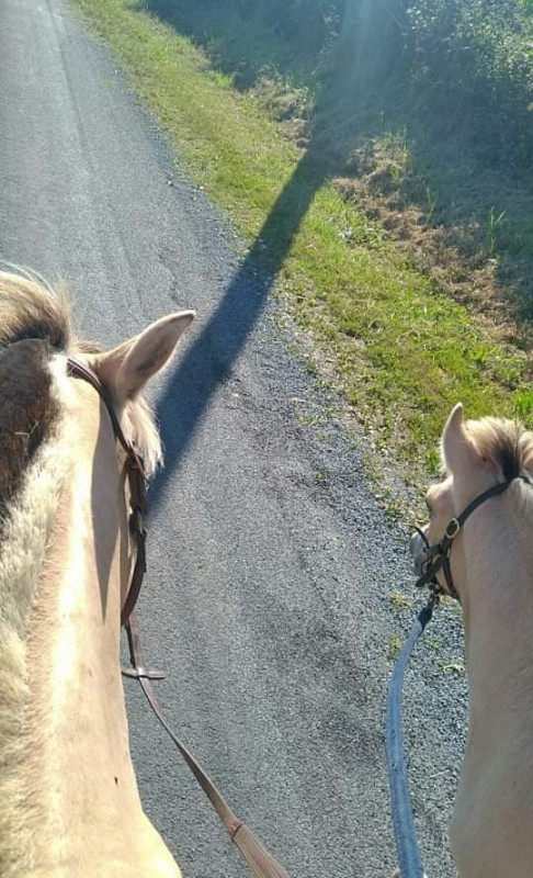 Myrtille était en mode "on y vaaaaaa lâche moiiiiii" mais restait aux ordres donc très bien. En plus Lupin a compris qu'il soit trottiner quand elle marche vite (avant il restait lent et tendait la longe, je devais freiner la jument).