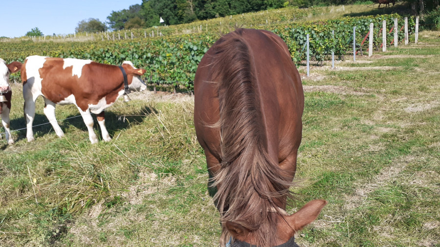 On a brouté un peu apres la ballade et elle m'a demandé un peu de bodywork . Il y a encore des taons mais il semblerait que ça diminue un peu . Les voisines les vaches sont venues nous tenir compagnie et se sont même couchées à côté apres