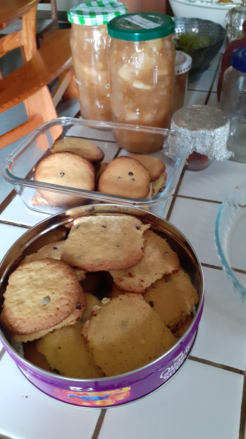 aujourd'hui ça n'a pas arrêté de pleuvoir alors j'ai fait de la compôte de pomme rhubarbe (avec qqs pommes "glanés par terre sous un pommiers sinon elles auraient pourri . Puis j'ai fait qqs cookies dans la foulée