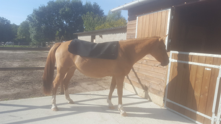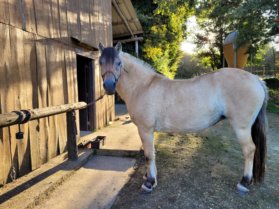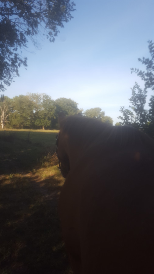On sort de la forêt, on arrive devant la ère maison du village, belle batisse juste rénovée, volets pimpants, rosier devant le perron en pierres de taille bien nettes... et là après plus d'1h passées dans la forêt Lotus me refait un énorme crottin ! grrr tu pouvais pas le faire m avant ????