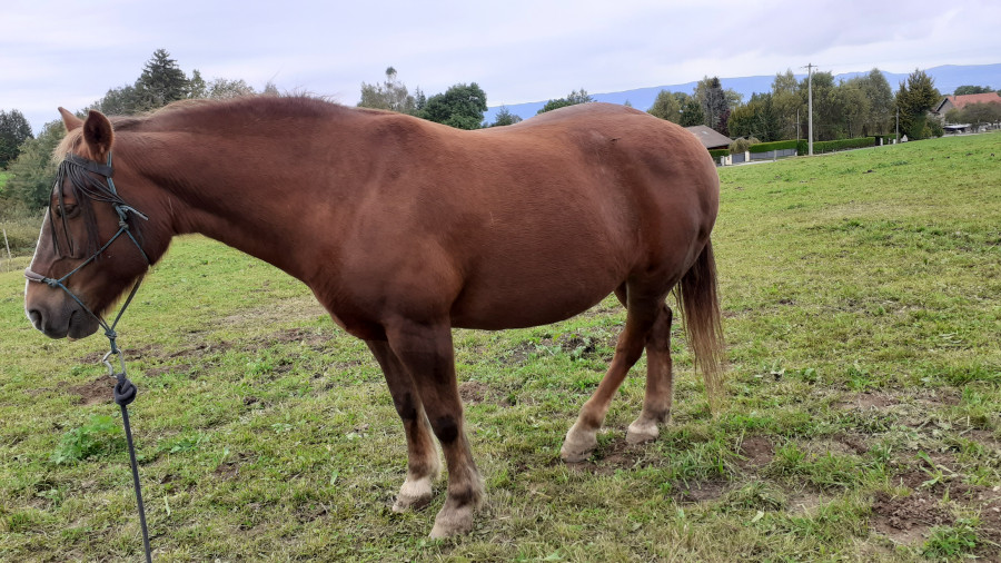 Une petite difficulté avec les déplacements latéraux, résolue en le mettant devant la haie pour le guider, ensuite longe, pas très à l'aise (il est très large et il lui faut de très grands cercles) et il précipite ! Donc j'ai surtout insisté pour qu'il sache faire 1 tour complet au pas, ensuite le trot calme et posé.