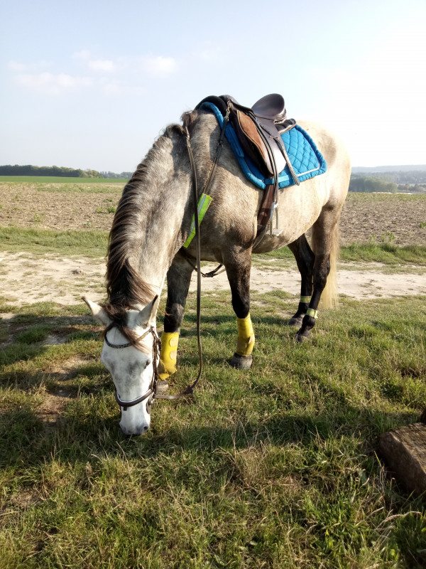 Hier attelage d'Oskar. Je suis allée le chercher et mis au paddock des Box vers midi, comme ça il mange 2h avant de partir. Leur pâture est grande mais ils ont bien "tout "mangé, il est "avide" d'herbe !