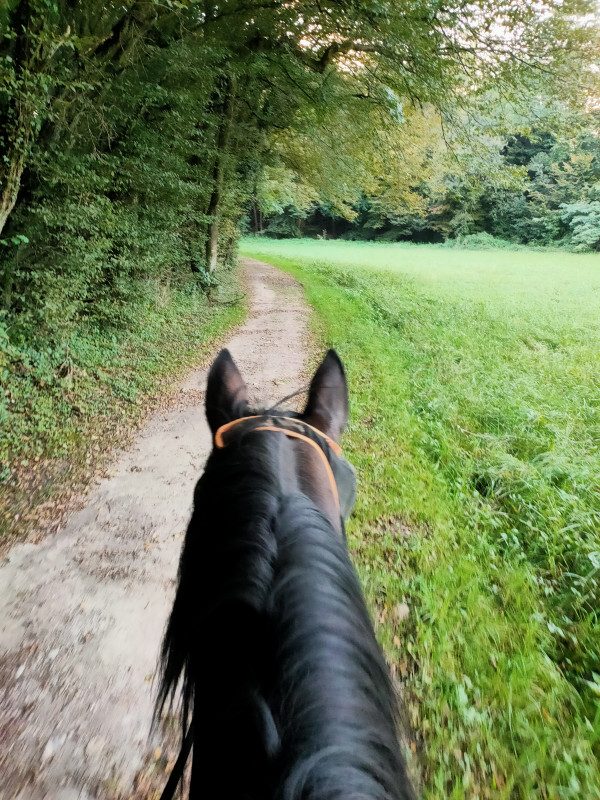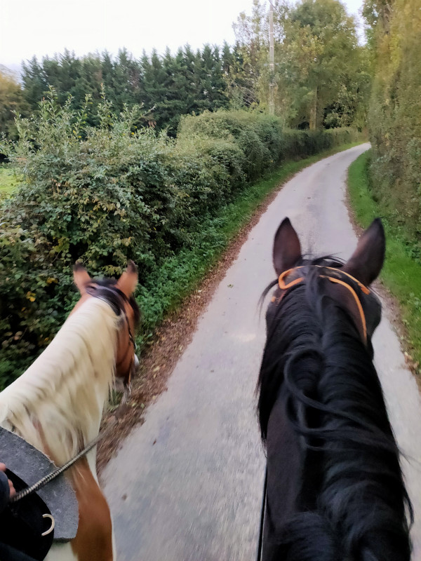 A un moment il voulait galoper mais j'avais pas une super maîtrise sans mors et j'ai craint des bonds de joie, pis comme ça glissait déjà au trot, j'ai pas osé de crainte qu'on se casse la figure. On s'est retrouvé en Belgique das la campagne... chemins vraiment pas mal faudra revenir quand ça sera moins marécageux et on pourra se régaler en faisant des allures !