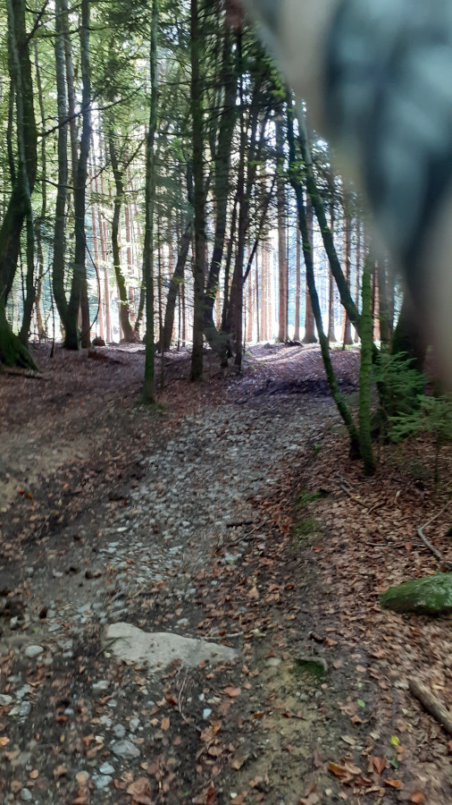 Ensuite au lieu de faire une boucle par la gauche, j'ai essayé par la droite. Les chasseurs ont préparé le terrain en fauchant plein de chemins ! On a pu trotter précautionneusement car ça glissait. Avec des Duplo Lotus a été à l'aise sur les cailloux pointus ! Bon avec ses gros sabots il glisse bcp sur la boue dure, peut -être plus que pieds nus.