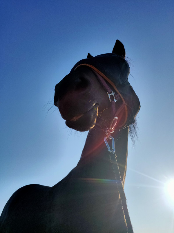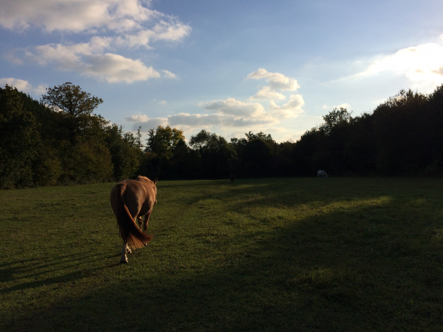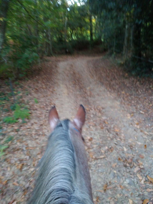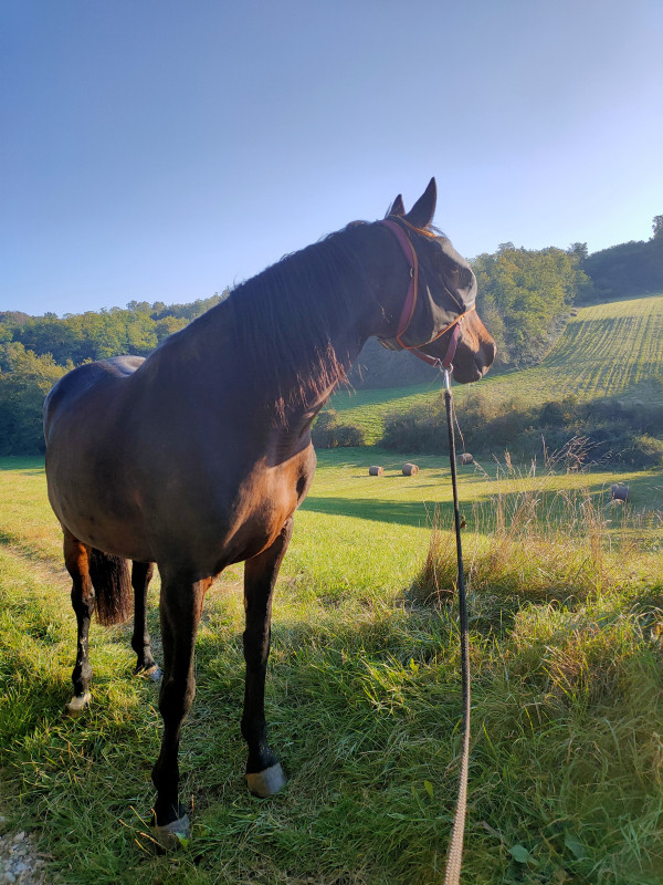 Ce matin, changement de pâture pour les hongres, ma belle-soeur commence par donner 5 pommes à son cheval méga-obèse, ensuite on démarre il était fin énervé, la dépassait en trottinant en déplacements latéraux... à un moment j'ai proposé une pause pour le faire redescendre en pression, il était monté sur ressort mais non elle est repartie de plus belle.