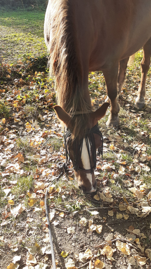 Dans le chemin on est passé devant l'entrée du pré, où le copain appelait, sans faire de caprice, par contre en voyant plein de pommes sous un pommier il a voulu s'arrêter, tirant sur les rênes, là j'ai dit non... Puis bien formaté, il s'est arrêté derrière la voiture pour attendre que je descende.