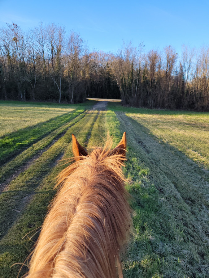 J'étais partie à pieds comme souvent maintenant. Puis à mi parcours j'ai posé la longe sur le dos de Myrtille. Réaction : arrêt immédiat, son dos en face de moi, tête tournée vers moi genre "et oh tu montes ?!?"... bon ben je monte alors !
